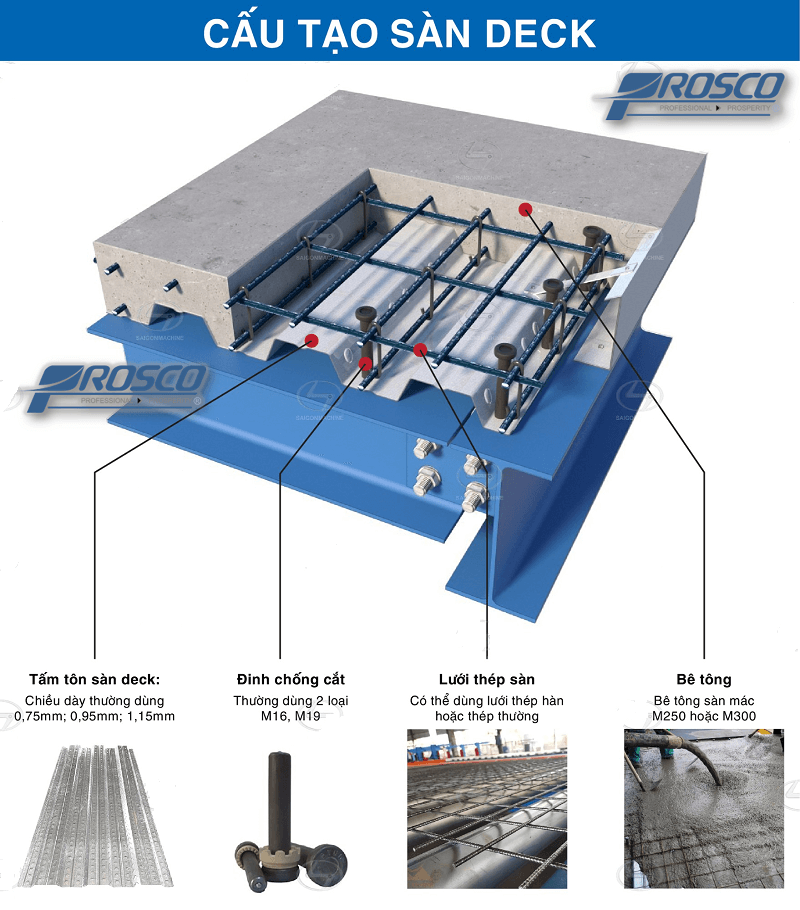 Sản phẩm đáp ứng các tiêu chuẩn quốc tế như Eurocode 4, SDI (Mỹ), JIS G3352 (Nhật), KS D3602 (Hàn Quốc). - Tấm sàn Deck cung cấp một mặt bằng vững chắc và có khả năng chịu tải trọng cao. Nó giúp tăng độ cứng và sự ổn định cho công trình. Ngoài ra, sàn deck được lắp đặt một cách nhanh chóng và dễ dàng.