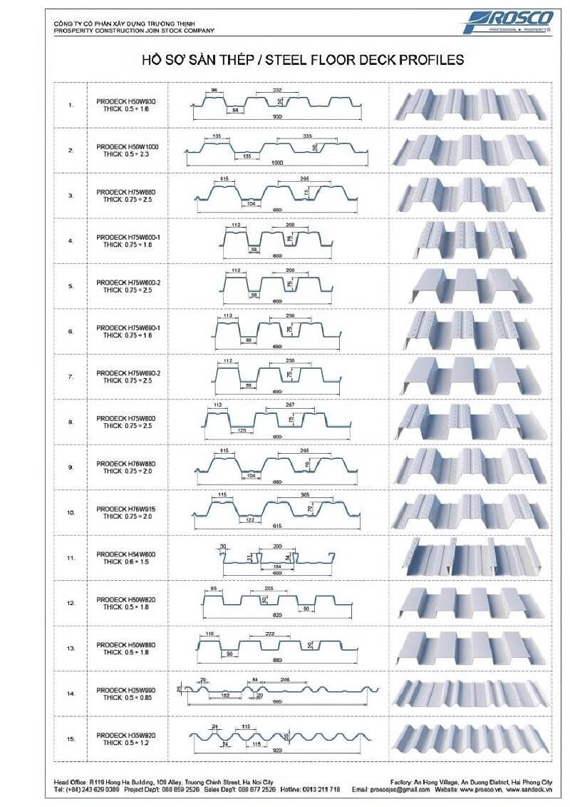 - Biên dạng của sàn liên hợp: H50W930 mm, H75W600 mm và H76W915mm.
